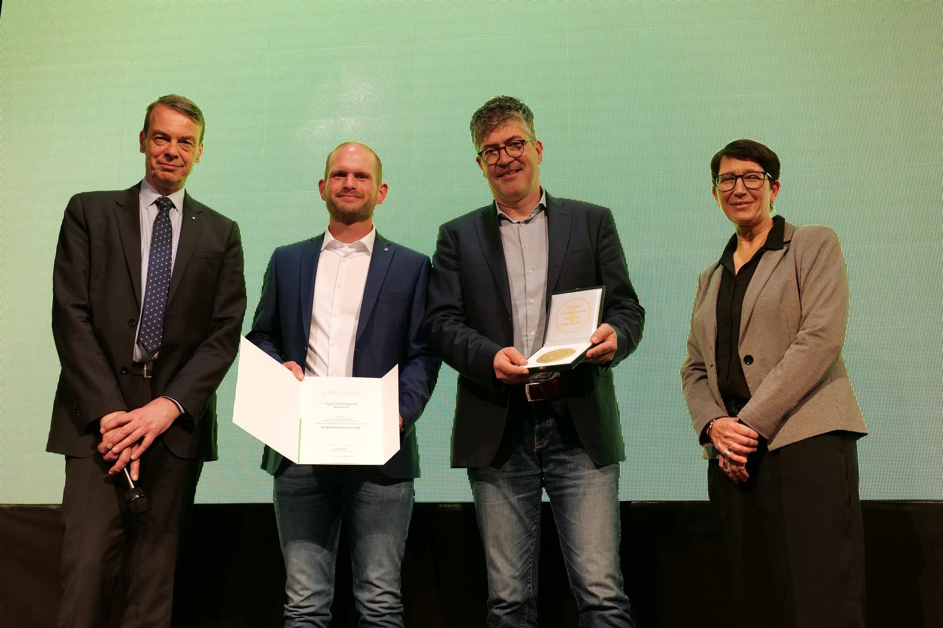 1_ Staatsehrenpreis 2023: Staatssekretärin Silvia Bender (BMEL, re.) überreichte den Staatsehrenpreis ihres Ministeriums an den Geschäftsführer der Firma Fichter, Matthias Scherbaum (2. v. re.) und Bauleiter Nils Schumacher. Links: BGL-Präsident Lutze von Wurmb (Foto: BGL/Thomas Henne Fotodesign)