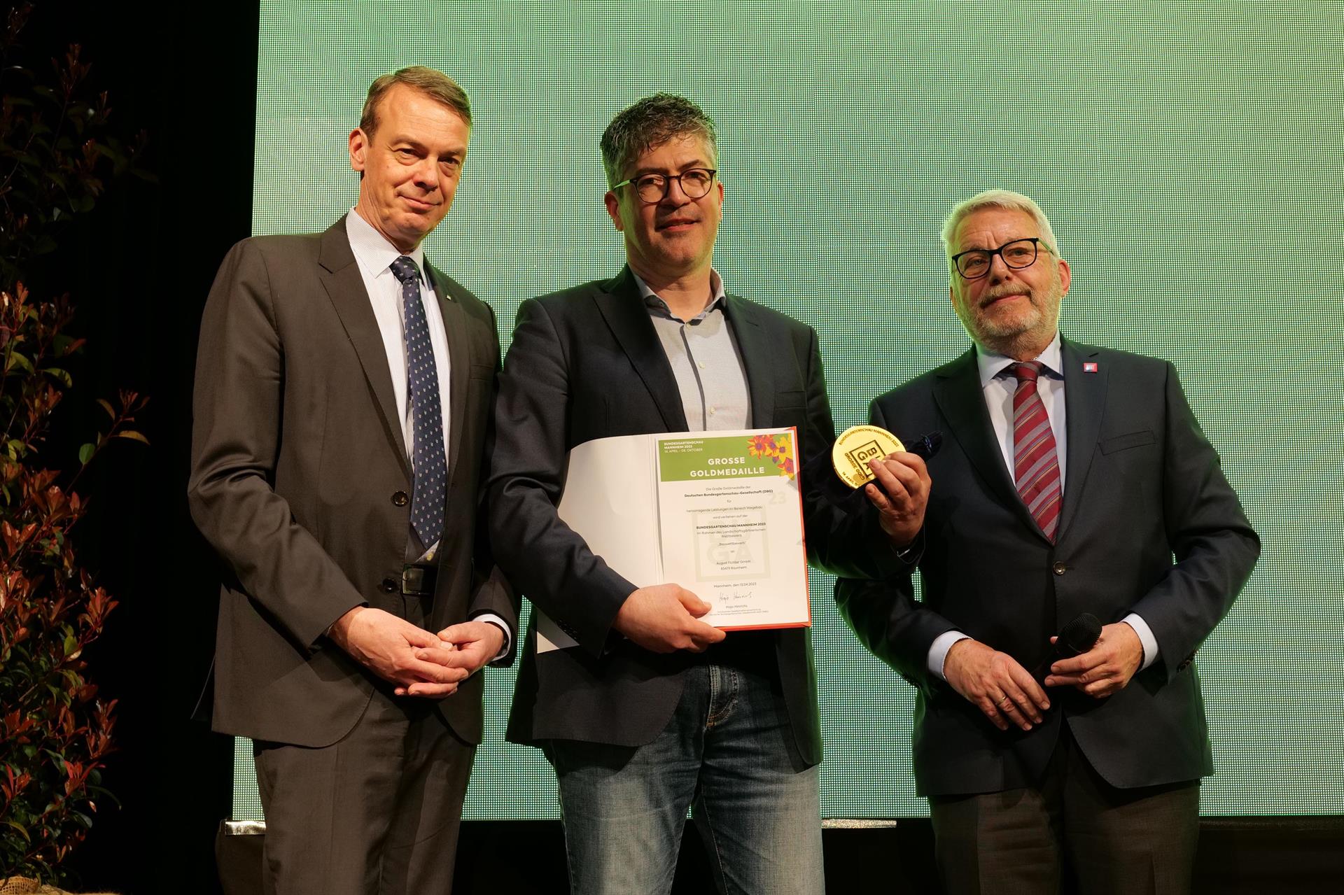 2_ Große Goldmedaille DBG 2023: Auch der Ehrenpreis der Deutschen Bundesgartenschau-Gesellschaft mbH (DBG) in Gold ging an die Firma Fichter, vertreten durch Geschäftsführer Matthias Scherbaum (Mitte), hier mit BGL-Präsident Lutze von Wurmb (li.) und DBG-Geschäftsführer Jochen Sandner. (Foto: BGL/Thomas Henne Fotodesign)