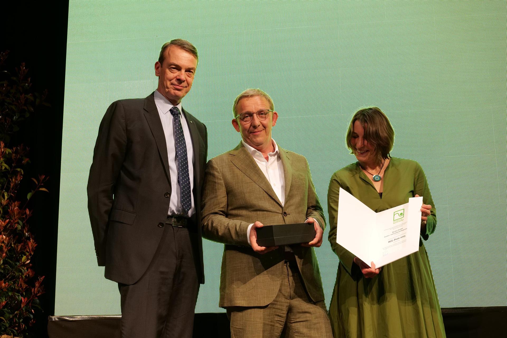 Mit dem BGL-Preis 2023 wurde die Firma Becker GmbH aus Zuzenhausen ausgezeichnet „für den vorbildlichen Bau von Treppenbauwerken und Belagsflächen auf der Bundesgartenschau Mannheim 2023 im Rahmen des landschaftsgärtnerischen Bauwettbewerbs“, so die Jury. Insbesondere würdigte BGL-Präsident Lutze von Wurmb bei der Preisübergabe, dass die Firma Becker auf dem Spinelli-Areal gleich mehrfach auf verschiedenen Baufeldern und „bis zum Schluss“ vertreten (gewesen) sei: „So hat Ihr Team bis kurz vor der Eröffnung mit unermüdlichem Einsatz maßgeblich zur Aufwertung des Innenhofs der U-Halle beigetragen. Die Jury lobt besonders Ihre Bauleistung bei der großen Portaltreppe. Auch im Klimapark West haben Sie die Jury begeistert: sowohl im Sportplatzbau, als auch mit den individuell angefertigten Gleisstegen. Ich wage die Prognose: Das wird ein Publikumsmagnet werden!“ Insgesamt gewann die Firma Becker sechs Goldmedaillen, drei Silbermedaillen und drei Bronzemedaillen.