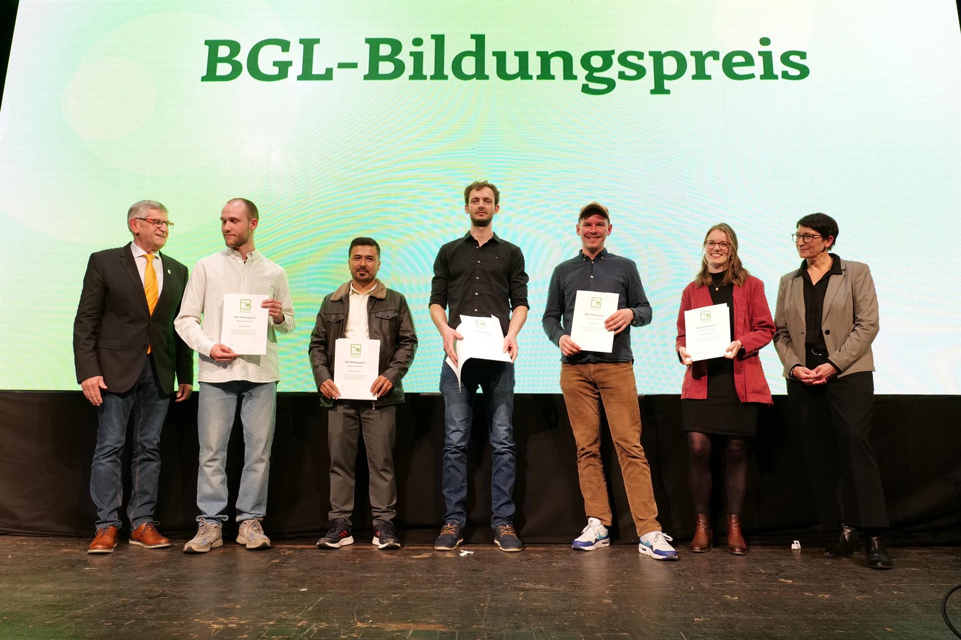 4_Die Gewinner*innen des BGL-Bildungspreises: BGL-Vizepräsident Paul Saum (ganz links) ehrte die Preisträger*innen in den Kategorien Aus- und Fortbildung. 5 der insgesamt 6 Nachwuchskräfte konnten in Mannheim dabei sein (v. li.):